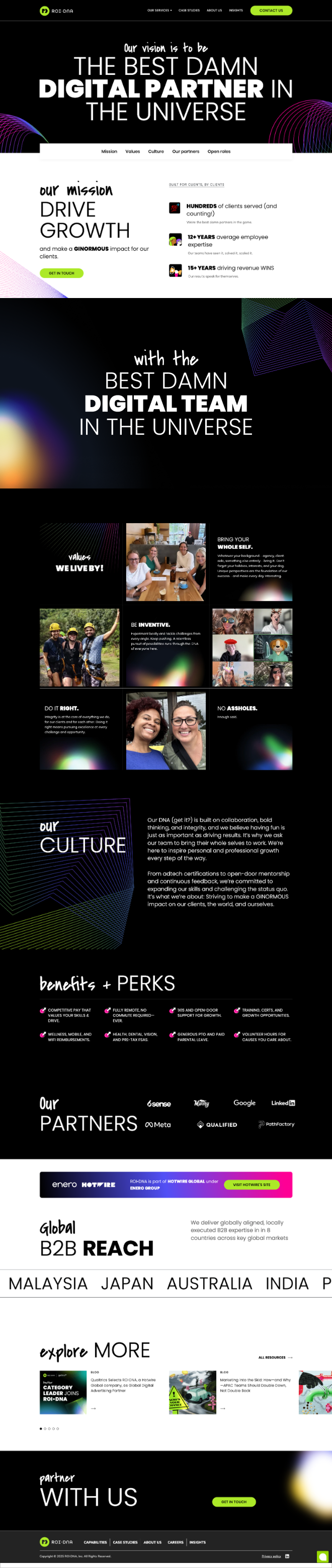 ROI•DNA’s brand had a bold, sassy personality that stood out, but it lacked the sophistication needed to resonate with a B2B audience. The website, voice and tone, visuals, and marketing assets didn’t fully reflect the agency’s expertise or authority, leaving an opportunity to refine the brand while preserving its unique edge.